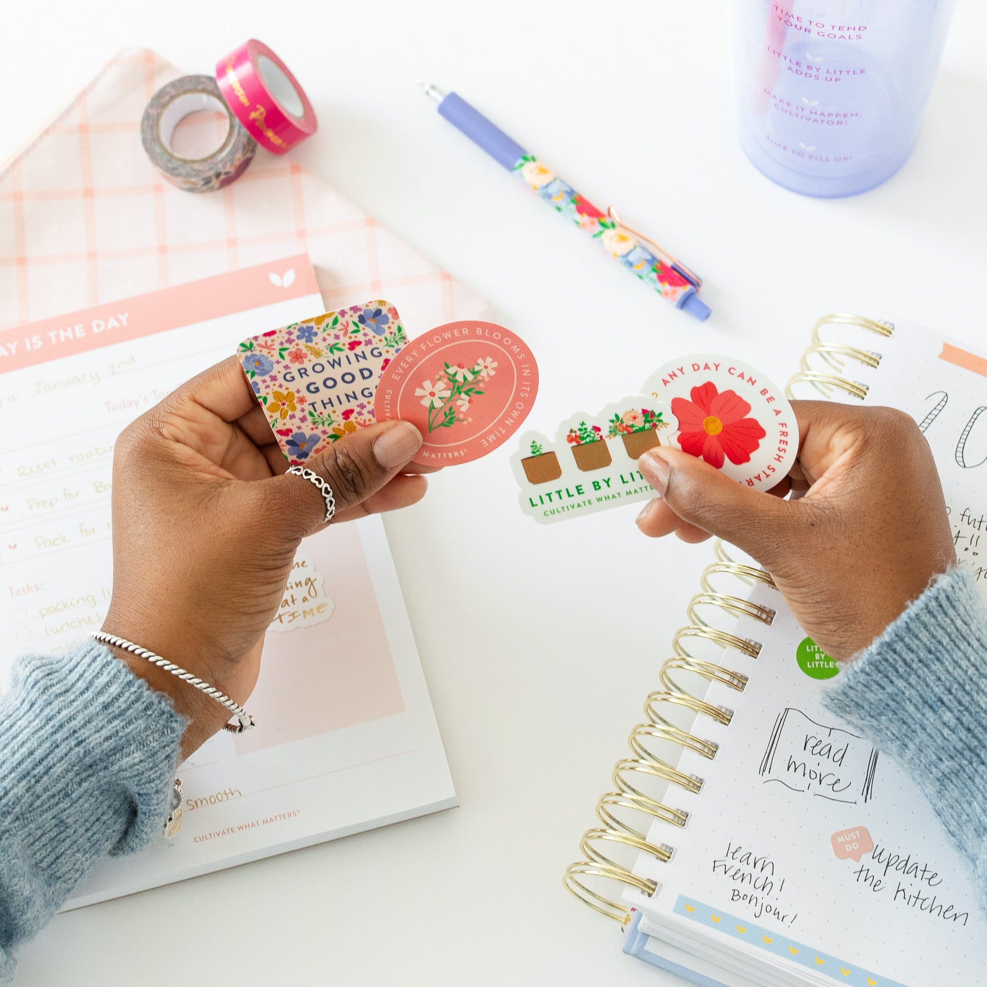 A little joy for every surface! The Growing Good Things Sticker Set offers sweet reminders to grow good things. Add a pop of motivation to your favorite notebook, vision board, phone, water bottle, computer, or use to decorate your planner. Wherever you choose to place them, these stickers spark a smile (and a little growth mindset, too!)
